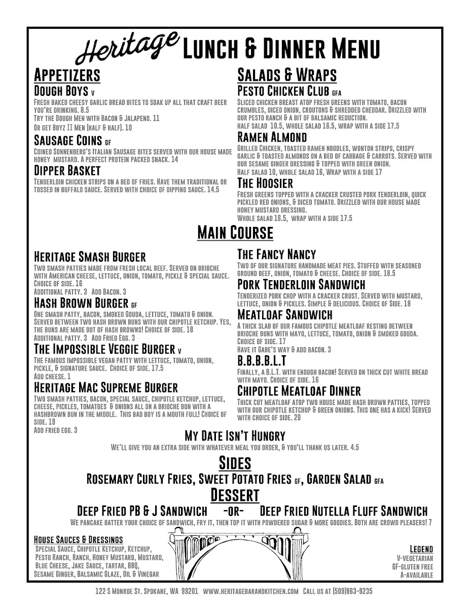 Heritage Bar & Kitchen offers a delightful and diverse menu that caters to a range of tastes, from appetizers to dessert. Starting with the Dough Boys, these crispy bites are a perfect way to kick off your meal. If you're in the mood for something savory and flavorful, the Sausage Coins are a great choice, offering a burst of taste in each bite. For something more substantial, try the Dipper Basket, which combines crispy treats with dipping sauces to satisfy your cravings.